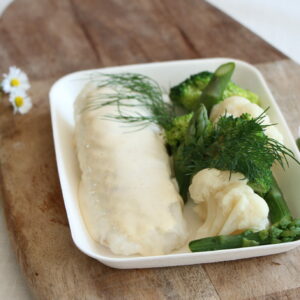 Pavé de cabillaud, sauce césar, légumes primeurs